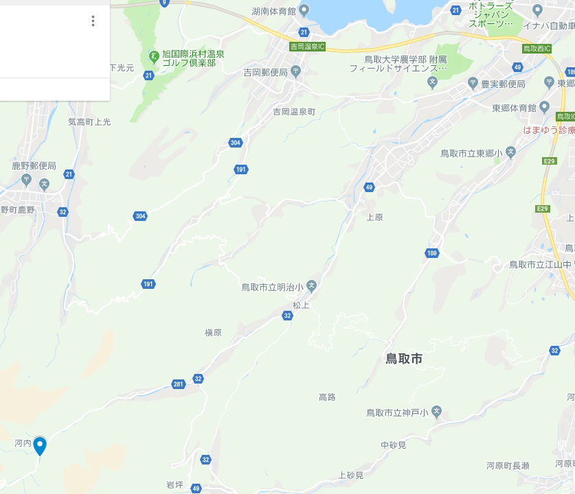 | 鳥取市内の方はお車で国体道路徳尾交差点より安蔵公園に向かって約20分、県外の方は鳥取西インターでお降りいただき 県道49号〜32号〜281号とお進みください。途中動物の飛びだしに気をつけてゆっくり景色を眺めながらおいでください。 |